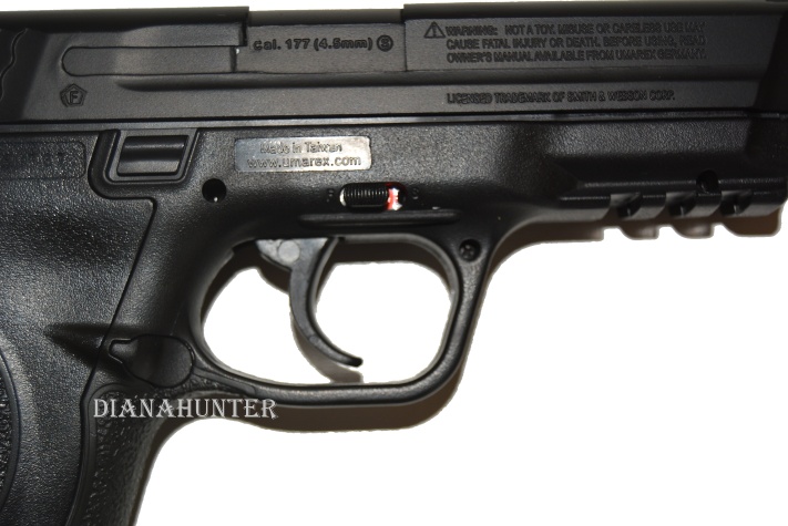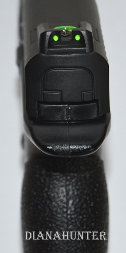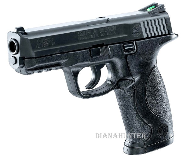 CO2 pištoľ je opatrená svetlo-vodivými mieridlami a muškou s bielym označením.